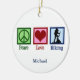 Cute hiker Christmas ornament gift with a pretty peace sign, heart, and person backpacking up a hike and bike trail. Personalised Peace Love Hiking present.