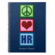 Peace Love HR notebook in dark blue for a human resources manager. A peace sign, heart, and HR written in blue. Customise with your rep name, business, or company on this cute monogram gift.