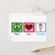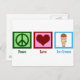 Pretty peace sign, heart, and a triple scoop of chocolate, vanilla, and strawberry ice cream in a cone. A cute ice cream parlour postcard for a dessert shop.