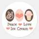 A peace symbol, heart and strawberry ice cream cone on ice cream lover tees, t-shirts, apparel, clothing and more merchandise and gifts that say Peace Love Ice Cream in pink and brown.
