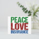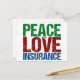 A cute insurance agent postcard featuring green, red, and blue letters that read Peace Love Insurance. Great gift for your insurance company co-workers.