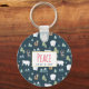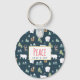 A keychain with a whimsical festive pattern. Polar bears, reindeers, trees. foxes, and snowflakes. On a dark green background.