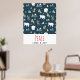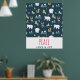 A poster with a whimsical festive pattern. Polar bears, reindeers, trees. foxes, and snowflakes. On a dark green background. Text says: Peace Love & Joy.