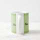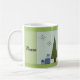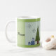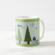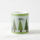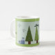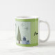 Whimsical green Christmas trees with pretty wrapped packages in blue. Dancing snowflakes and wonderful words, peace, joy and love accent this design. Lovely Christmas mug to add to your collection or give.