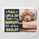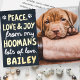 Design is composed of a dark background with a funny message --- "Peace, Love & Joy from my Hoomans"