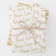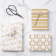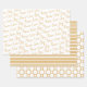 This set of coordinating Christmas gift wrapping paper features the first design of handwritten style text "Peace-Love-Joy" in gold on white. The second is white stripes on a gold background and the third is gold circles on a white background.