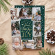 Beautiful typography based holiday photo card features eight of your favourite family photos arranged in a collage layout. "Wishing you peace, love and joy" appears in the centre in gold foil hand lettered typography on a rich hunter green background dotted with festive stars. Personalise with your family name beneath.