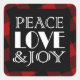Add a bold dose of colour to your Christmas envelopes with this peace, love and joy envelope seal. It begins with a red and black buffalo plaid background. Peace Love and Joy and written in bold white typography and placed in the centre of a black square.