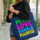 Cute Peace Love Kamala Harris blue tote bag for a progressive democrat who loves fun, colourful political designs. Vote for Kamala for president in the 2024 election. A fun liberal design in bright colours.