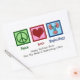 A beautiful nephrologist holiday sticker for a kidney specialist. Peace Love Nephrology Christmas stickers for your favourite doctor or nurse in that medical department featuring a peace sign, heart, and a drawing of pink kidneys.