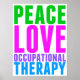 A cute occupational therapy poster for a trendy occupational therapist in pretty colors. Peace Love OT office decor in green, pink, purple, and blue.