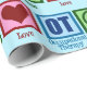 Cute occupational therapist wrapping paper for Christmas gifts featuring a peace sign, heart, and OT. Peace Love Occupational Therapy gift wrap.
