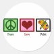 A peace sign, a heart, and an artist's palette of bright paint colours and paintbrush.