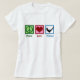 Peace Love Pilates. A cute pilates instructor t-shirt featuring a peace sign, heart, and woman stretching over an exercise ball.