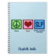 A cute custom SLP notebook for your speech therapist that reads Peace Love Speech Language Pathology. A cool personalised speech pathologist gift. A great journal for someone to keep their speech therapy notes on patients.