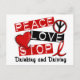 Stand up to Drinking and Driving with Peace Love Stop Drinking and Driving t-shirts and gifts featuring hip label text, a peace symbol, heart, and red Drug Awareness ribbon.
