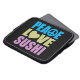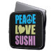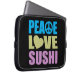 Peace Love Sushi...What else do you need in life? Perfect gift for any sushi addict. It doesn't matter if you're a trained sushi maker, you're a foodie blogger who loves to try out the latest sushi restaurants, you're an at home chef who loves to put your own spin on sushi recipes, or you love to go out for sushi with friends on girls night out...you're addicted to sushi! Funny gift idea for any sushi lover. Great for a sushi diva. Design features a heart and a peace sign. See our shop for more fun and unique Peace Love...shirts and gifts.