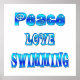 Share your love for swimming with this shiny blue design saying Peace Love Swimming. Great gift for a swimmer.