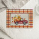 Thanksgiving greeting card with vintage red truck filled with fall pumpkins on a fall plaid background. Add your own message to the back.