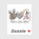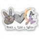 Sleek and playful Halloween sticker featuring the words Peace, Love, Witch paired with a peace-hand sign, a heart icon, and a witch perched on a crescent moon. A clean, symbolic design for lovers of whimsy, witchcraft vibes, and modern spooky style.