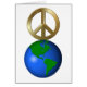 Clever Rebus style word puzzle design with a metallic gold peace symbol on top of a 3-d green and blue Earth globe to represent the popular holiday greeting "peace on Earth"