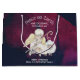 A christian themed gift bag. Designed with a sweet angel with yellow wings holding a shepherds crook. Sitting with white fluffy lambs. Navy blue and burgundy watercolor background, with tiny flecks of faux gold sparkle glitter (not actual glitter just a printed image). Text says: peace on earth and goodwill towards all. Merry Christmas from <name>.