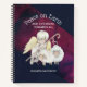 A christian themed personalised spiral notebook. Designed with a sweet angel with yellow wings holding a shepherds crook. Sitting with white fluffy lambs. Navy blue and burgundy watercolor background, with tiny flecks of faux gold sparkle glitter (not actual glitter just a printed image). Text says: peace on earth and goodwill towards all.
