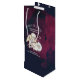 A christian themed wine gift bag. Designed with a sweet angel with yellow wings holding a shepherds crook. Sitting with white fluffy lambs. Navy blue and burgundy watercolor background, with tiny flecks of faux gold sparkle glitter (not actual glitter just a printed image). Text says: peace on earth and goodwill towards all. Merry Christmas from <name>.