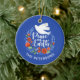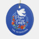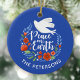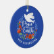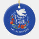 A pretty Christmas ornament featuring a dove in a floral wreath with the words Peace on Earth. The Christmas ornament is designed in royal blue, red and white. An elegant holiday ornament for your Christmas tree. Personalize it with your name. Designed for you by Blackberry Boulevard.