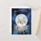 Send warm holiday wishes with this delightful snow globe postcard with a soft watercolor reindeer with bells on standing in the snow inside with trees in the distance and the sun shining above. At the base there is a tag in front with the words Peace on Earth and the globe appears to be lit with a snowy and wispy night sky in the background.