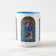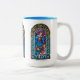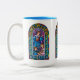 Peace on Earth Pre-Raphaelite style Xmas / New Year ceramic mug. Featuring llustrations in water color and colored pencil, of a stained glass design after Burne Jones.