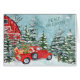 The front of this Holiday greeting card is an impressionistic image of a winter rural forest scene, complete with a red barn, snow covered pine trees, and a truck filled with Christmas goodies. The red truck is parked in the snow, and snowflakes drift down around it. The text at the top says "Peace on Earth". The inside of the card has four text fields for you to customise.