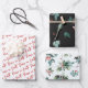 Peace on Earth winter watercolor botanical berry pattern wrapping paper. Features three separate designs, red Peace on Earth modern script word art pattern on white, delicate watercolor leaves and berry pattern on black slate and winter holly leaves berries and evergreens on pale green.