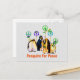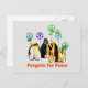Cute penguins of all shapes and sizes hold peace signs decorated with flowers as they march in a protest for Peace. Text says "Penguins For Peace."