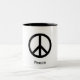 Coffee mug with a picture of a peace sign and says peace under the peace sign