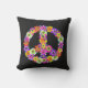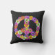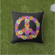 A floral peace sign in shades of pink, yellow, orange, purple, green, white and black makes up the centerpiece on this boho chic throw pillow.