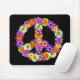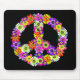 A floral peace sign in shades of pink, yellow, orange, purple, green, white and black.