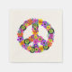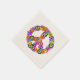 This paper napkin has a floral peace sign in shades of pink, turquoise, yellow, orange, purple, green and black.