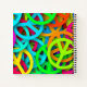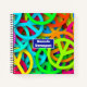 A personalised spiral notebook with a sixties vibe. Cool peace signs in bright and vibrant colours featuring all the colours of the rainbow.