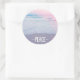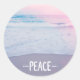 Round glossy sticker with a beautiful ocean scene and 'peace' typography.