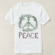 the traditional peace sign, made out of green leaves and flowers. with the words peace underneath it written again using leaves and flowers, this time with purple