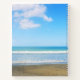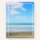 Custom piece to put in a name, or other custom text as preferred. This personalised notebook would make a lovely journal for recording travel, holidays, dreams, daily diary records, goals, gratefulness journalling and more. The outer cover on both the front and the back has a peaceful beach photo, with light coloured natural sand of tan, a beautiful blue green sea with the white tips of low waves breaking gently, and above a graduated blue sky, interrupted by fluffy white clouds. This serene beach vista is overlaid with white text for a name or even the function of the piece, such as Dream Diary, Scrapbook, or Travel Journal 20XX.