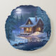 A peaceful scene in a snowy winter forest. A cozy cabin with warm light glowing in its windows, Christmas lights on its porch roof and a wreath on its door sits under a full moon surrounded by tall pine trees.