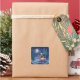 A peaceful scene in a snowy winter forest. A cozy cabin with warm light glowing in its windows, Christmas lights on its porch roof and a wreath on its door sits under a full moon surrounded by tall pine trees.