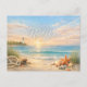 This serene New Year design captures the calm beauty of a coastal sunrise. Gentle waves roll onto a sandy shore scattered with seashells and bright starfish, while soft dune grasses frame the foreground. A weathered rope and driftwood add rustic seaside charm, leading the eye towards a distant lighthouse standing against a glowing pastel sky. Warm golden light reflects across the ocean, blending with tranquil blues and soft peach tones to create a soothing atmosphere. Elegant script lettering floats above the horizon, complementing the peaceful, reflective mood of welcoming a fresh new beginning by the sea.