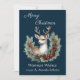 This card features a beautiful deer, with a partial wreath; the wreath is decorated with greenery and holly berries. This design is set against a deep blue backdrop, with light grey text, which can be changed by the customer.