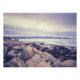 A panoramic view of a rocky coastline with a vast expanse of water stretching out in the distance. The sky is a soft, muted purple with wispy clouds, and a flock of pelicans flies in formation across the frame. The foreground is dominated by large, grey and brown boulders, weathered by the sea. The water is calm and reflective, with a hint of blue in the distance. The image was taken at Pebble Beach, California.