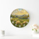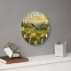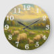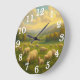 Serene countryside clock depicts grazing sheep on lush green grass under sunlit mountains and fluffy clouds. White numerals and black hands on a vibrant pastoral scene create tranquil charm—ideal for farmhouse decor or nature lover gifts.