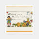 A cute Pilgrim is holding a turkey on platter with harvest scene of pumpkins and vines, a wild turkey, a gold haystack, a country cottage, and assorted fruits. Greeting: Wishing you a Peaceful Thanksgiving. Image of a Vintage Penny postcard from 1919 with a tiny gold border.