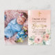 Elegant Baptism Photo Thank You Postcard.. Design featuring watercolor peach, blush pink background and gold geometric oval frame and floral arrangement on the front with gold cross and Baptism in gold foil script. Add more details on the back of the postcard. To edit this template click customise further.